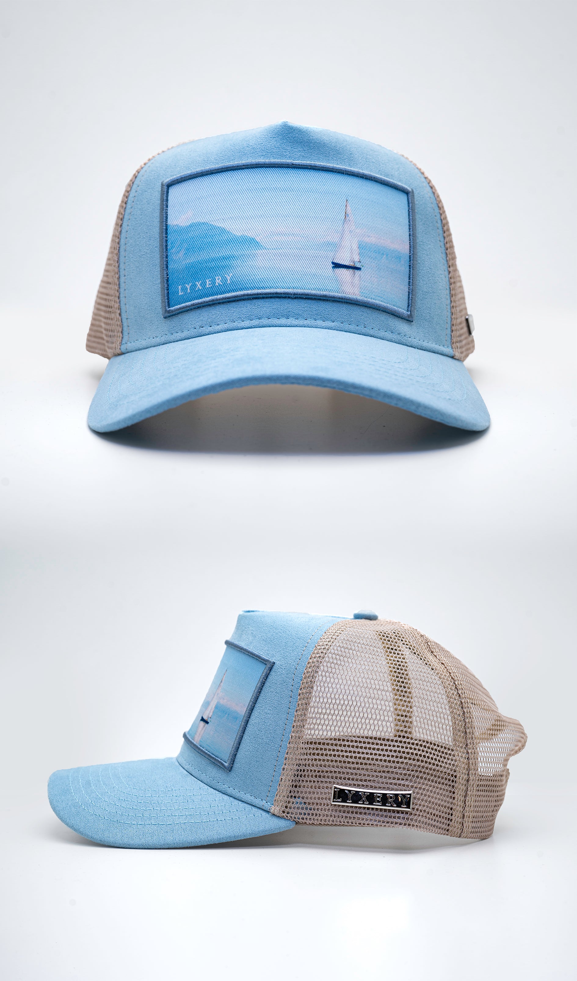 Trycket på kepsen visar en vacker båt som glider över det bländande blå vattnet.